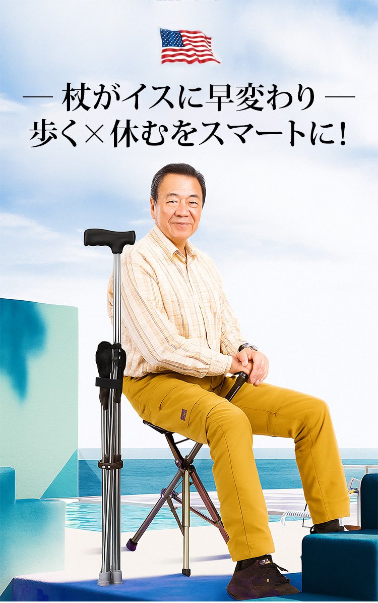 1秒で椅子に変わる杖、いつでもどこでも休憩可能!5段階調整可能、140cmから190cmまで対応!